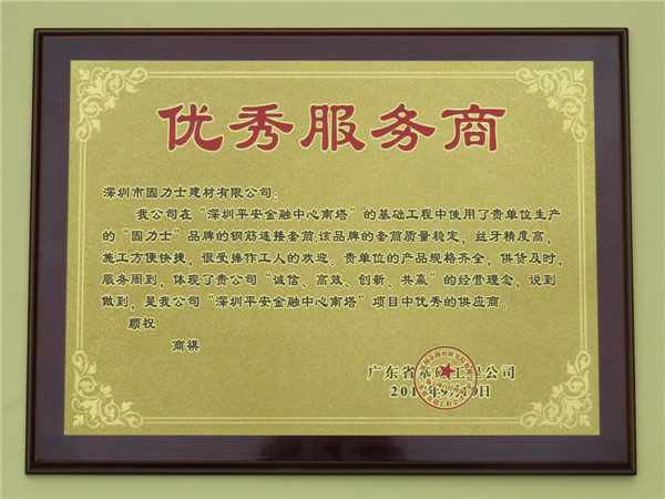 我公司在“深圳平安金融中心南塔”的基礎(chǔ)工程中使用了貴單位生產(chǎn)的固力士品牌直螺紋鋼筋連接套筒。該品牌的直螺紋鋼筋連接套筒質(zhì)量穩(wěn)定,絲牙精度高,施工方便快捷,很受操作人人的歡迎。貴單位的產(chǎn)品規(guī)格齊全,供貨及時,服務(wù)周到,體現(xiàn)了貴公司一切為客戶服務(wù)的經(jīng)營理念,是我公司深圳平安金融中心南塔項(xiàng)目中優(yōu)秀的直螺紋鋼筋連接套筒供應(yīng)商。