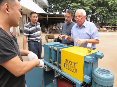 我們首先陪同凱文一行參觀了我們的新工廠。該工廠采用了全新套筒加工工藝。保證套筒絲牙精度達(dá)到6H級。套筒內(nèi)徑、外徑、長度等指標(biāo)也全部達(dá)到國家最新JG/T163-2013鋼筋連接套筒標(biāo)準(zhǔn)。是廣東省內(nèi)少數(shù)幾家能達(dá)到此標(biāo)準(zhǔn)的生產(chǎn)企業(yè)。其間,凱文和黎生拿起我們生產(chǎn)的直螺紋套筒,不時點(diǎn)點(diǎn)頭。用英語交流了起來。凱文是英國最早從事鋼筋套筒行業(yè)的少數(shù)人之一。其在英國推廣的鋼筋籠技術(shù)一直使用至今。到今天入行年限已超過40年。真可謂一生只做一件事的典范。其行事風(fēng)格極其嚴(yán)謹(jǐn),是最典型的英國技術(shù)人才。嚴(yán)謹(jǐn)、負(fù)責(zé)是其身上最突出的特點(diǎn)。而黎生作為我們較早合作的外商之一,精通四種語言,以其鮮明的國際化令我們十分欽佩。